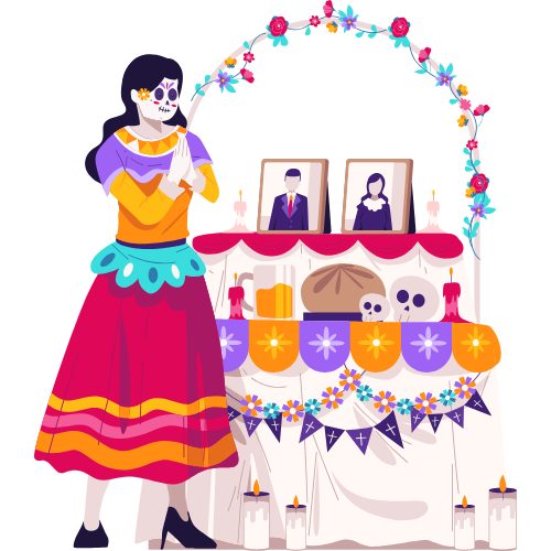At the heart of the tradition is the ofrenda—an altar of remembrance adorned with marigolds (cempazúchitl), candles, food, drink, and photographs of loved ones. These offerings are not objects of worship, but symbols of love and memory.